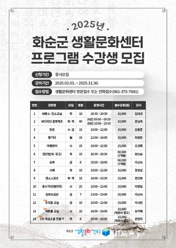 접수방법 : 생활문화센터 방문접수 또는 전화접수(061-375-7081)